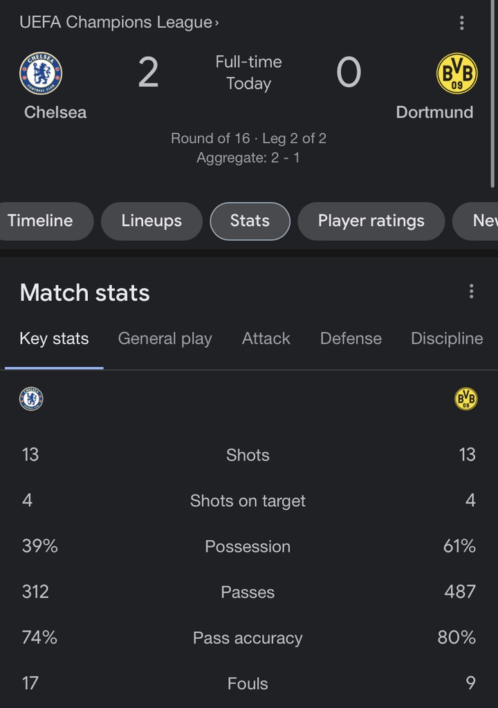 The home side Chelsea recorded 74% passing accuracy, 266 passes, 4 shots on target and 42% ball possession while Borussia Dortmund recorded 79% passing accuracy, 5 shots off target, 8 shots and 372 passes.