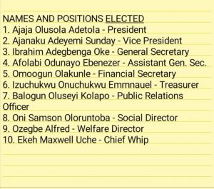 Oni Samson Oloruntoba was appointed as the Social Director, Ozegbe Alfred as Welfare Director, while Ekeh Maxwell Uche was appointed as the Chief Whip.