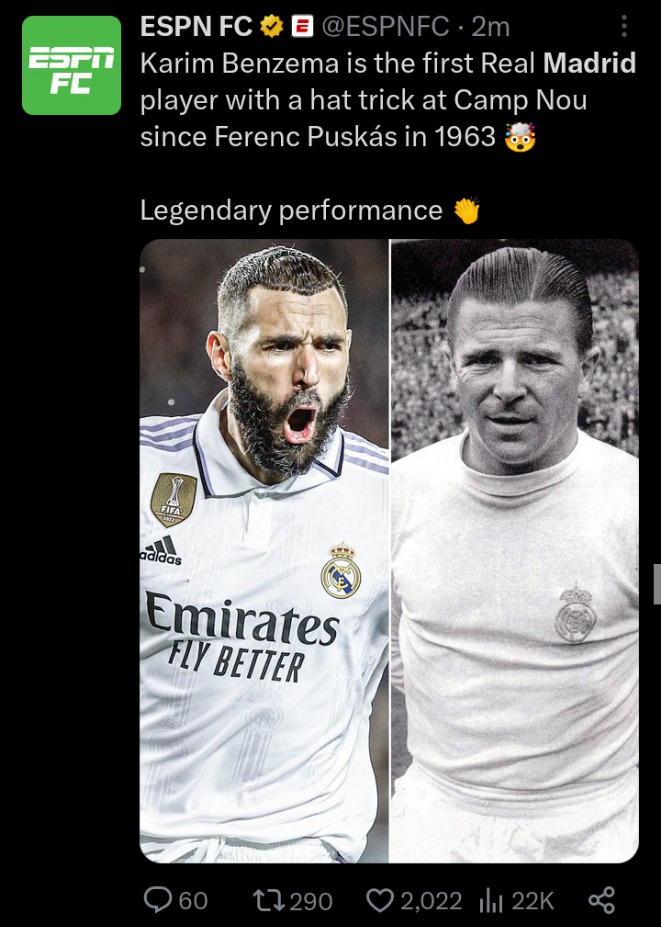 After the break, Benzema rose to the occasion with a hat-trick to become the first Real Madrid player to score thrice in a single match at the Camp Nou since Ferenc Puskás in 1963 (some 60 years ago).