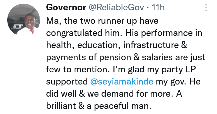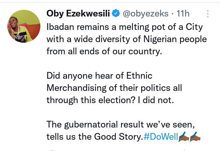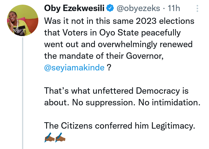 Taking to her verified Twitter handle a few hours ago, Ezekwisili reacted to Makinde’s victory by expressing her pleasure at how peaceful the elections in Oyo were and how the people came together to unanimously give the governor a second term in office.