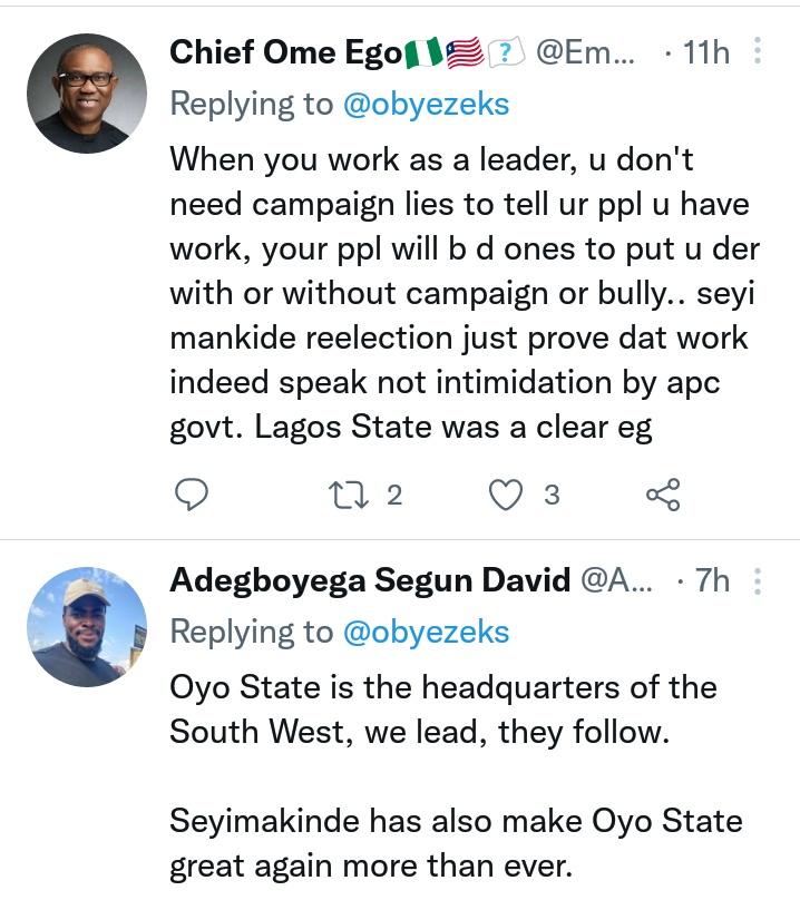 While some persons attributed Makinde’s victory to his stellar performance during his first term in office, others concurred with her on how peaceful the people of Oyo are.
