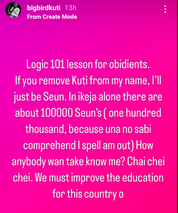 Seun Kuti reportedly said and, quote, “Logic 101 lesson for obidients. If you remove Kuti from my name, I’ll just be Seun. In ikeja alone there are about 100,000 Seun’s (one hundred thousand, because una no sabi comprehend I spell am out) How anybody wan take know me? Chai chei chei. We must improve the education for this country o.”