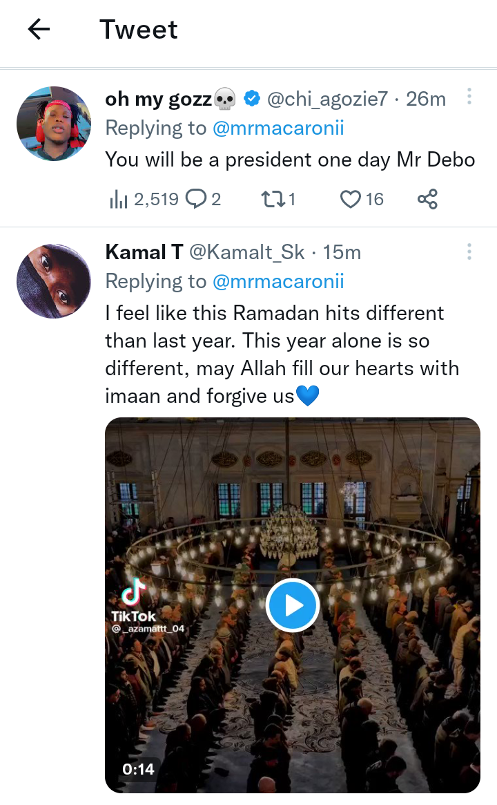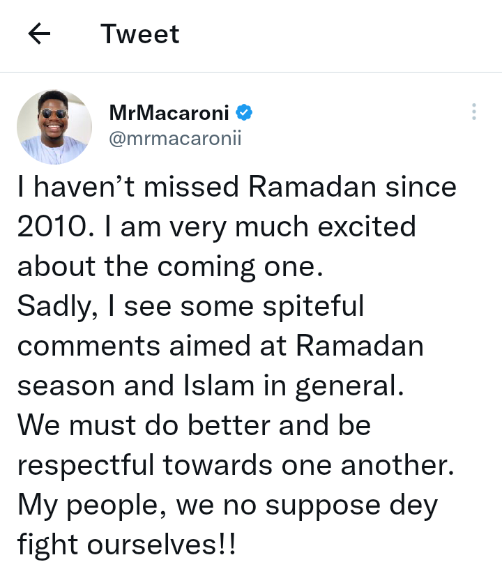 The Nigerian comic skit maker tweeted: “I haven’t missed Ramadan since 2010. I am very much excited about the coming one. Sadly, I see some spiteful comments aimed at Ramadan season and Islam in general. We must do better and be respectful towards one another. My people, we no suppose dey fight ourselves!!”